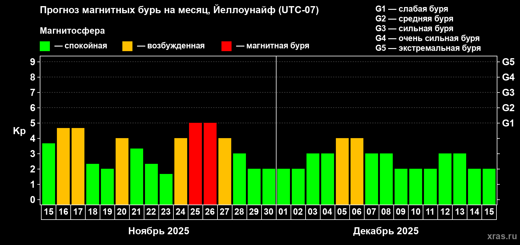 Прогноз магнитных бурь в Йеллоунайфе на 15 ноября 2025 года