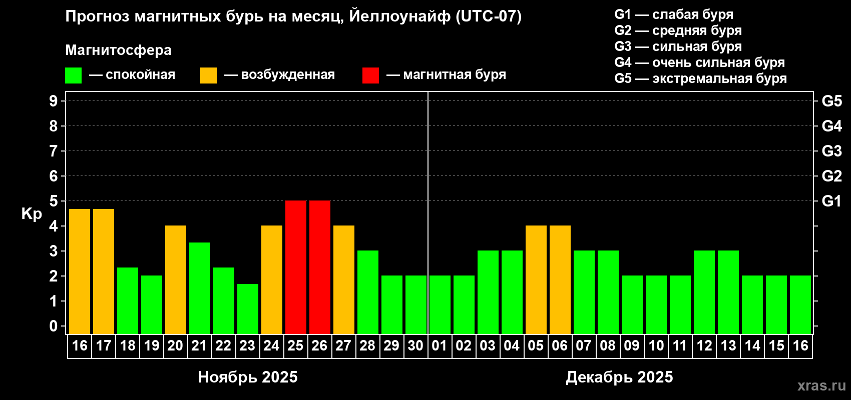 Прогноз магнитных бурь в Йеллоунайфе на 16 ноября 2025 года
