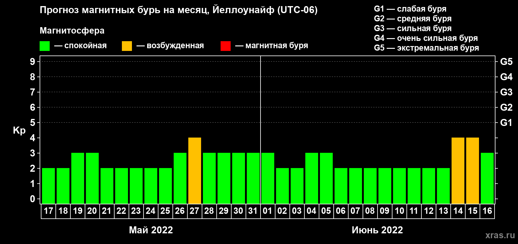 Прогноз магнитных бурь в Йеллоунайфе на 17 мая 2022 года