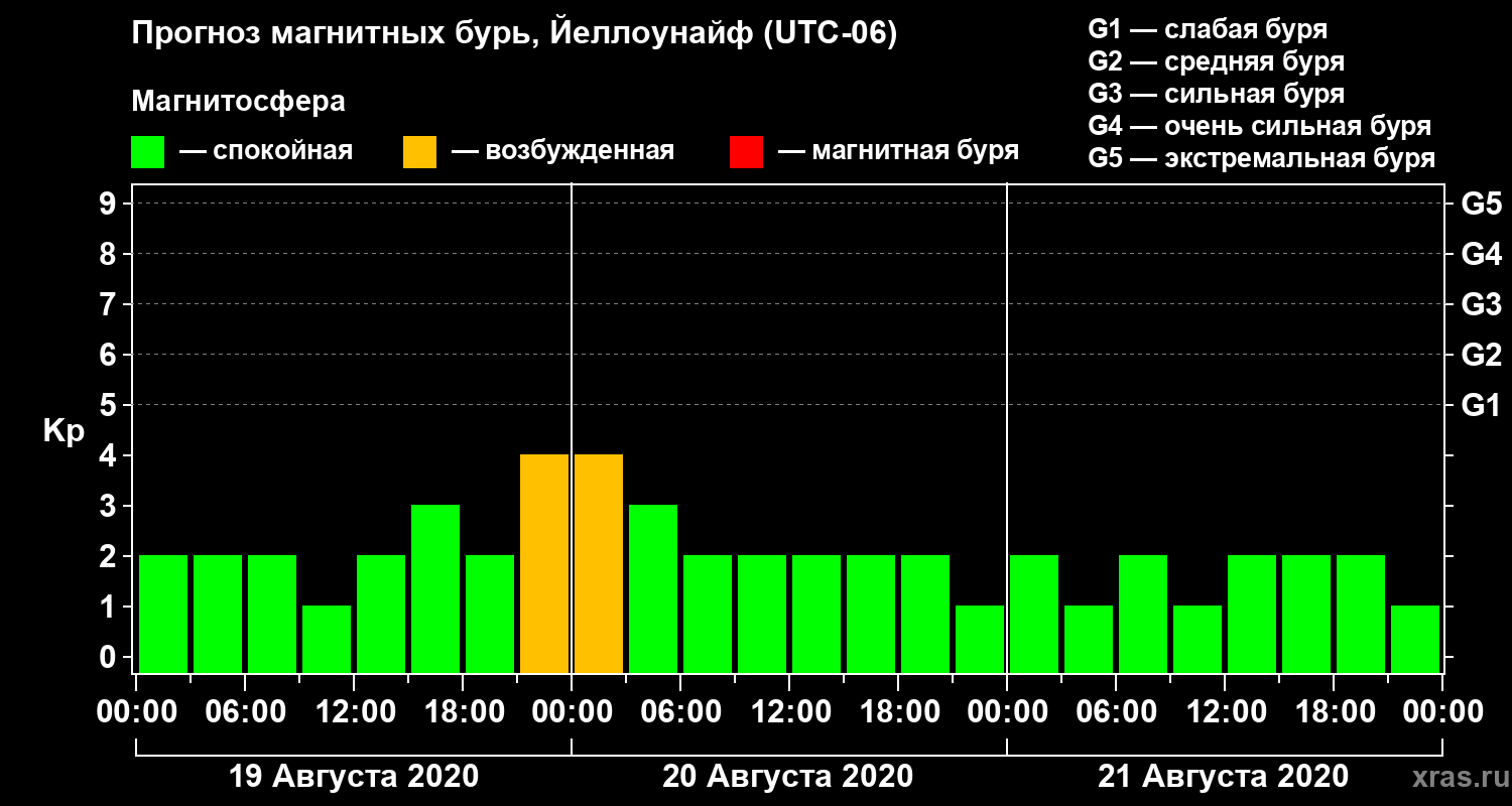 Прогноз магнитных бурь в Йеллоунайфе на 19 августа 2020 года