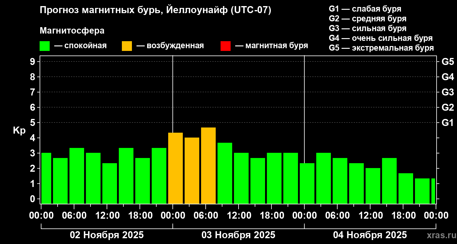 Прогноз магнитных бурь в Йеллоунайфе на 2 ноября 2025 года