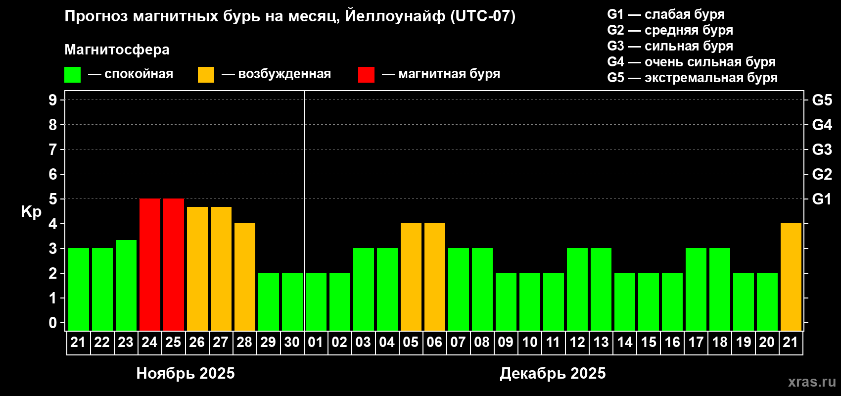Прогноз магнитных бурь в Йеллоунайфе на 21 ноября 2025 года