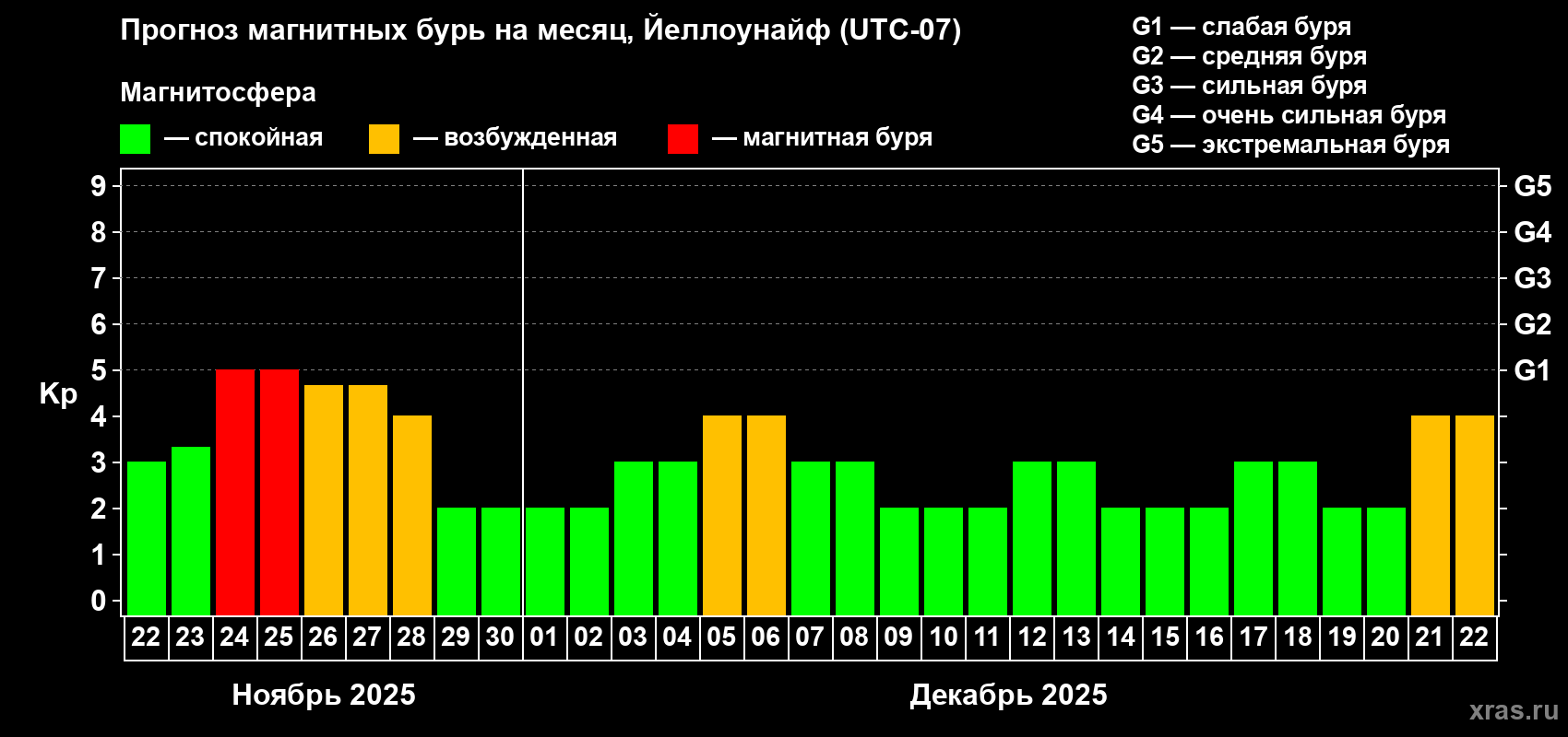 Прогноз магнитных бурь в Йеллоунайфе на 22 ноября 2025 года