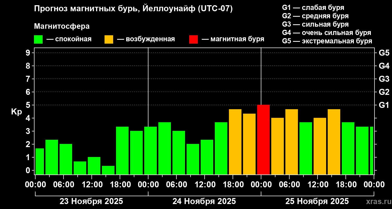 Прогноз магнитных бурь в Йеллоунайфе на 23 ноября 2025 года