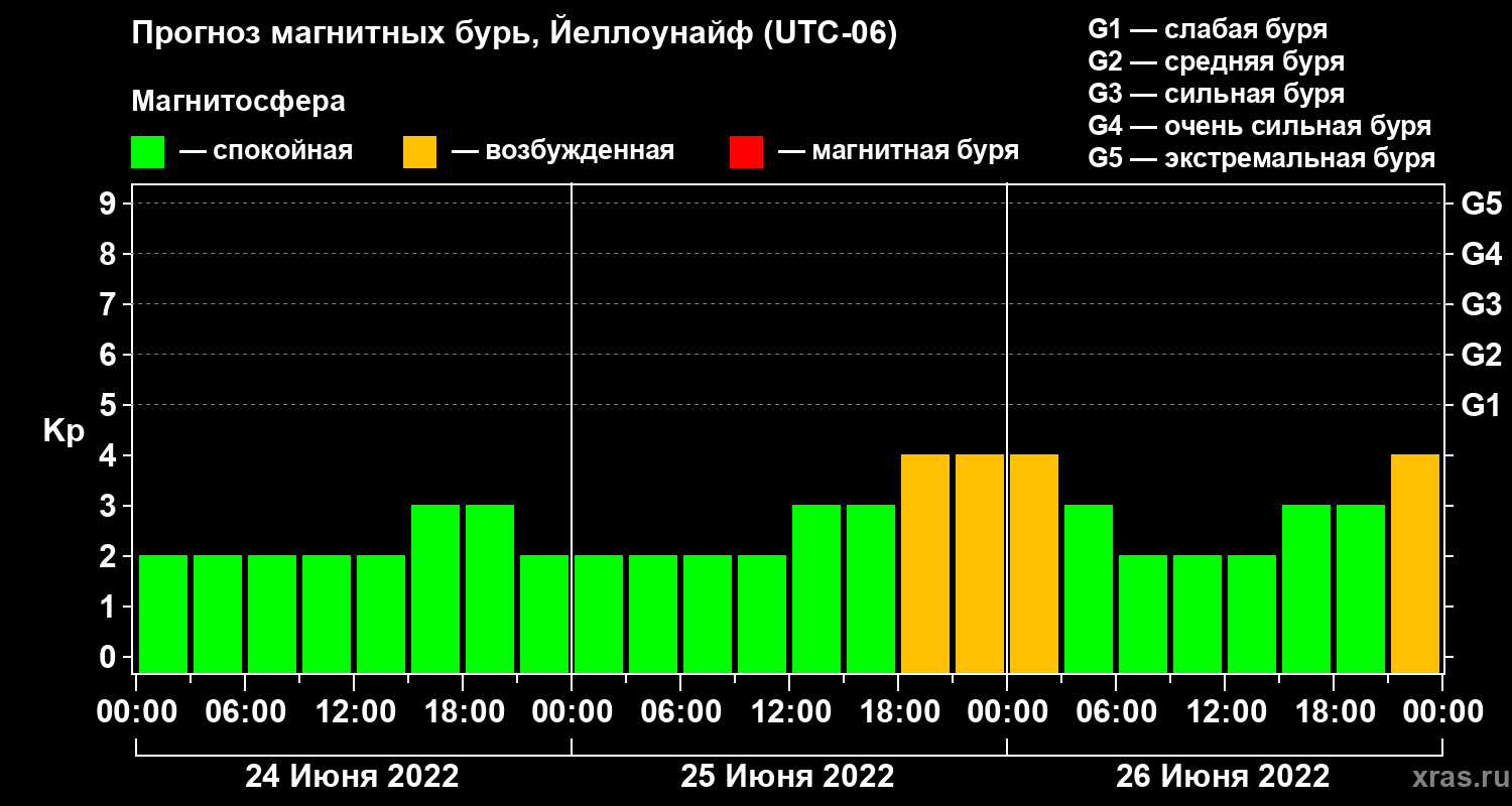 Прогноз магнитных бурь в Йеллоунайфе на 24 июня 2022 года