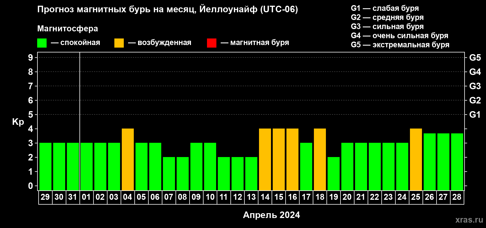 Прогноз магнитных бурь в Йеллоунайфе — 29 марта 2024 года