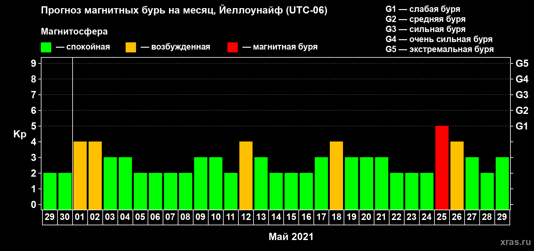 Прогноз магнитных бурь в Йеллоунайфе на 29 апреля 2021 года
