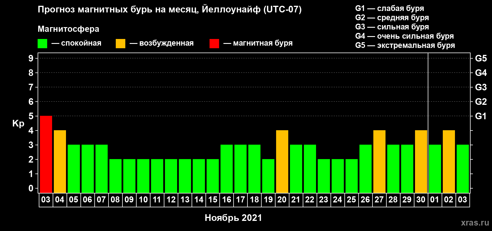 Прогноз магнитных бурь в Йеллоунайфе на 3 ноября 2021 года