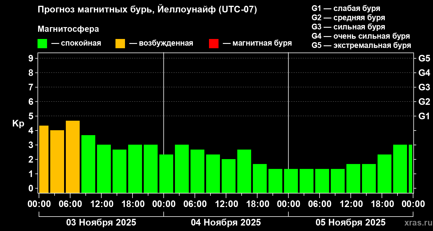 Прогноз магнитных бурь в Йеллоунайфе на 3 ноября 2025 года