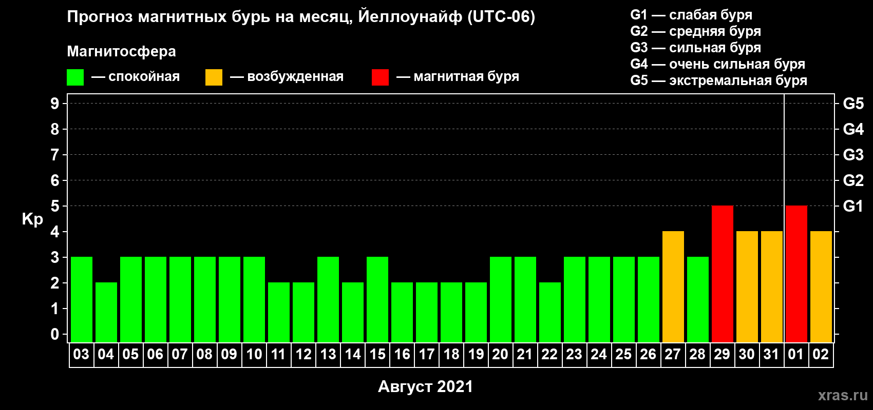 Прогноз магнитных бурь в Йеллоунайфе на 3 августа 2021 года