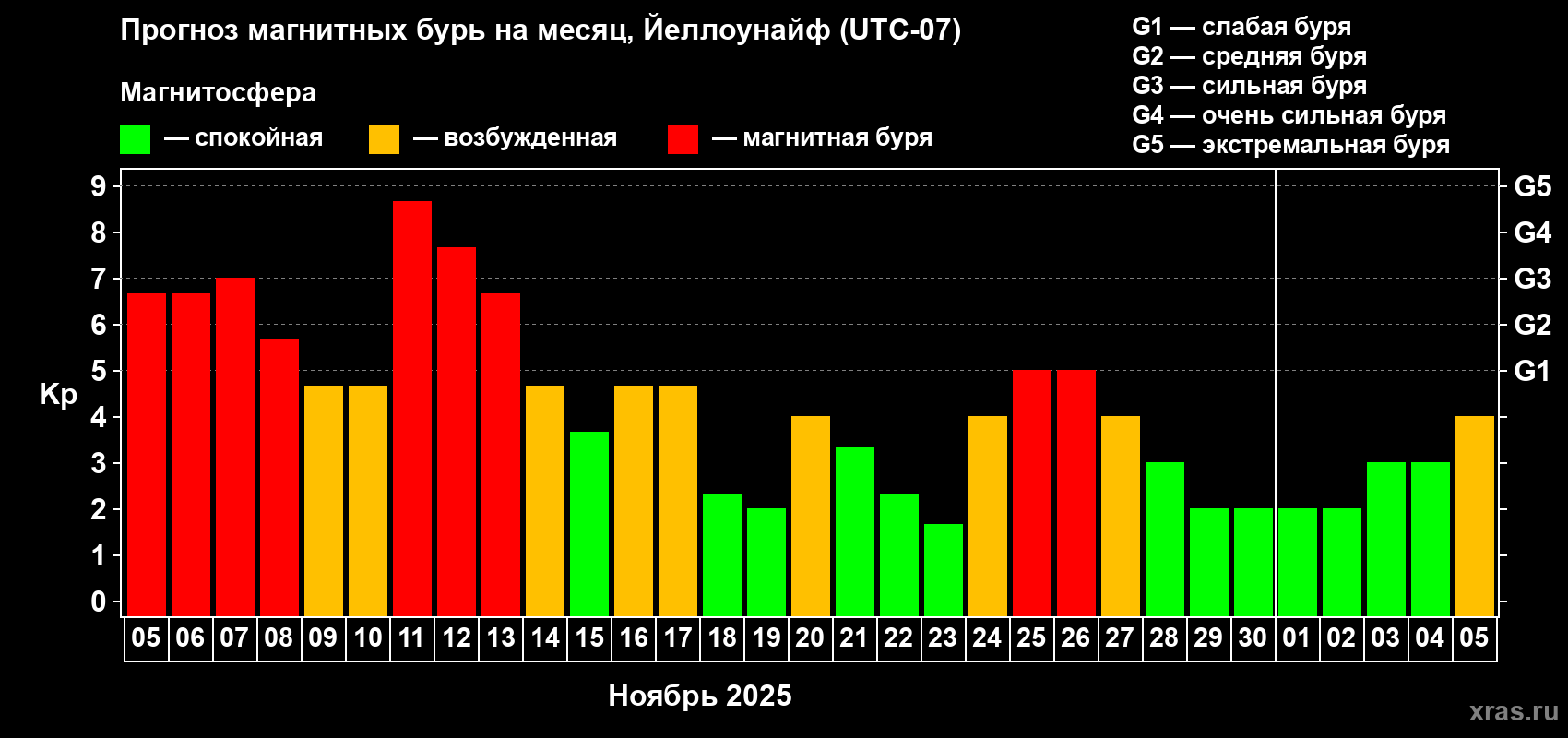 Прогноз магнитных бурь в Йеллоунайфе на 5 ноября 2025 года