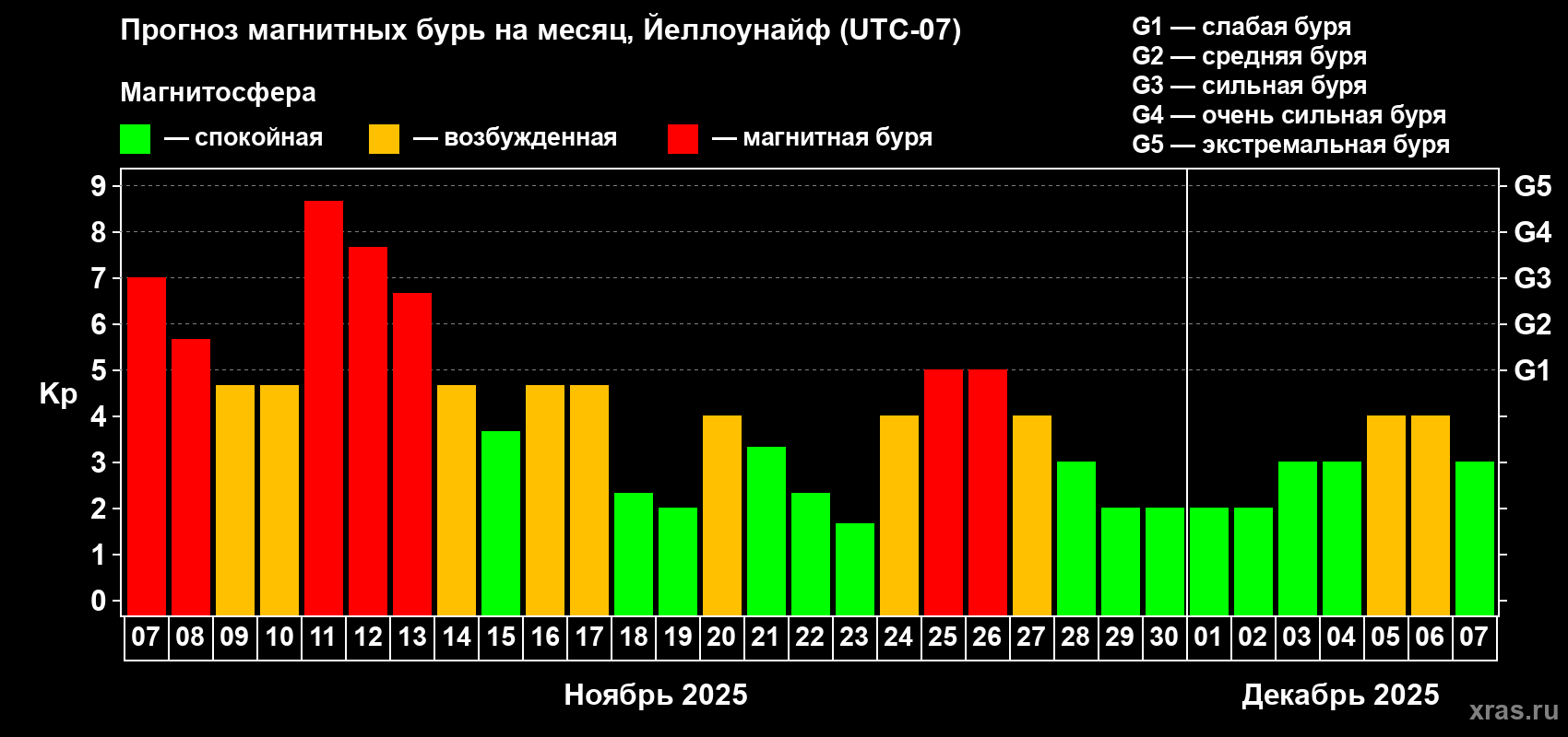 Прогноз магнитных бурь в Йеллоунайфе на 7 ноября 2025 года