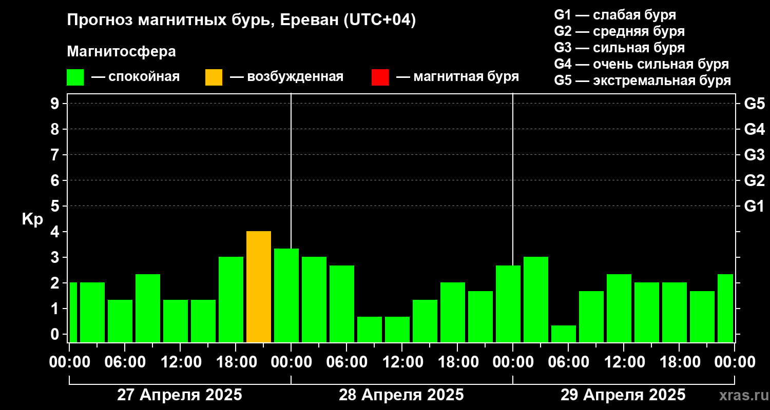 Прогноз магнитных бурь в Ереване на 27 апреля 2025 года