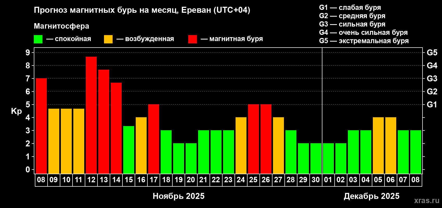 Прогноз магнитных бурь в Ереване на 8 ноября 2025 года