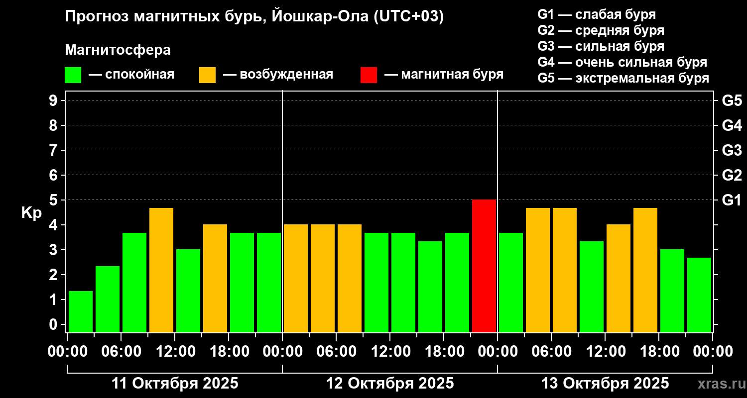 Прогноз магнитных бурь в Йошкар-Оле — 11 октября 2025 года