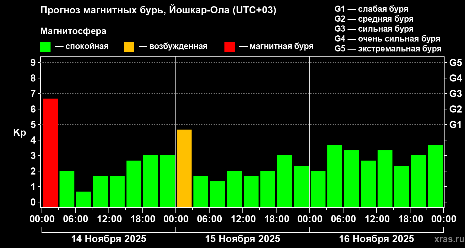 Прогноз магнитных бурь в Йошкар-Оле на 14 ноября 2025 года