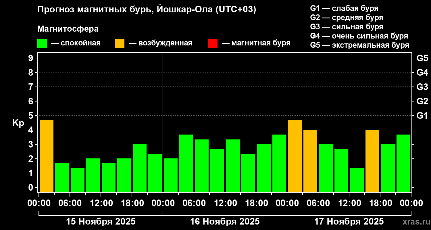 Прогноз магнитных бурь в Йошкар-Оле — 15 ноября 2025 года
