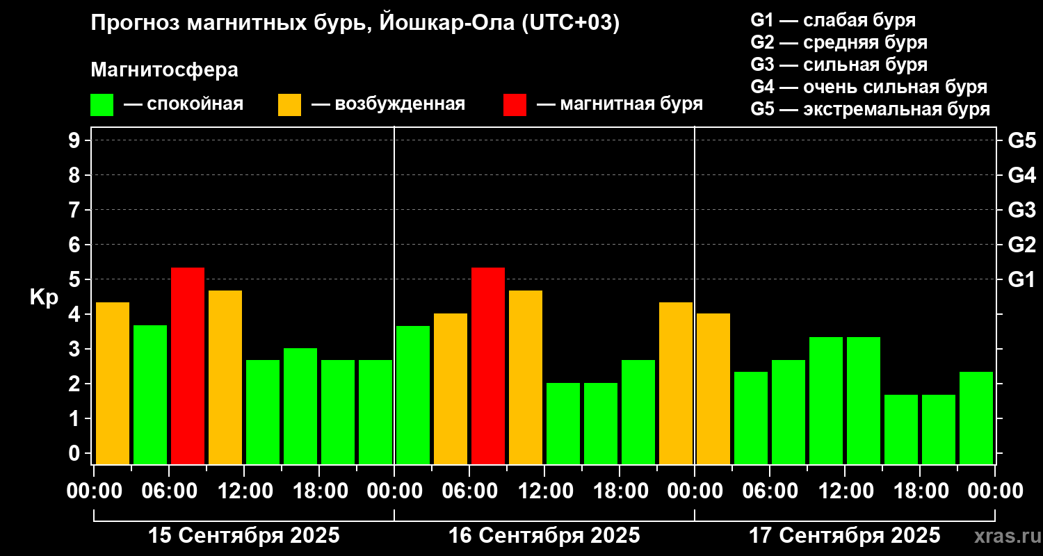 Прогноз магнитных бурь в Йошкар-Оле на 15 сентября 2025 года