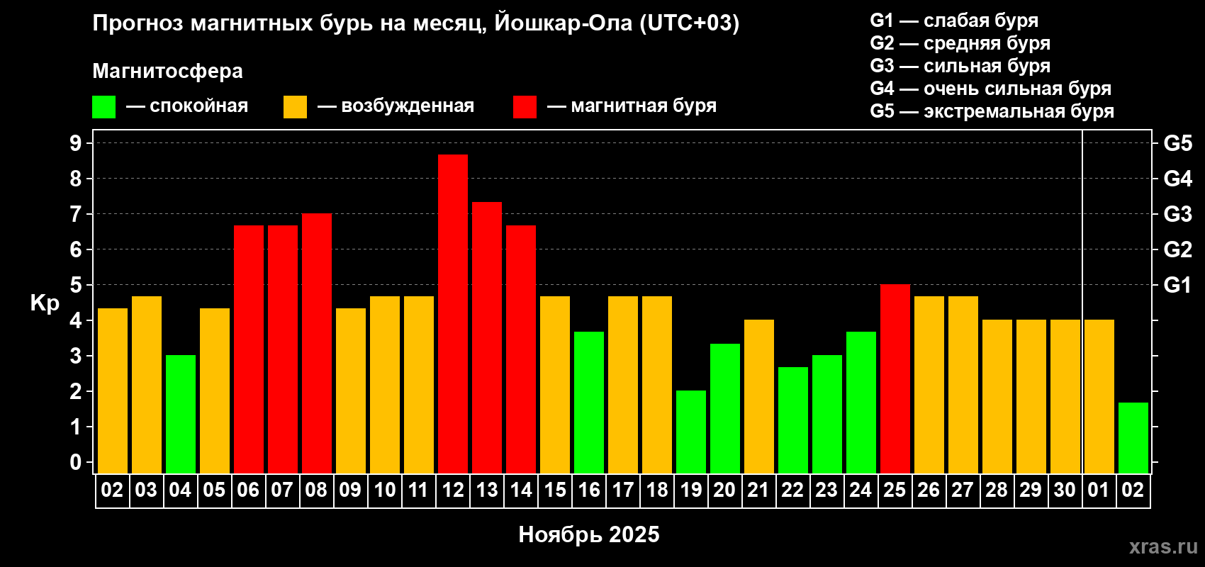 Прогноз магнитных бурь в Йошкар-Оле — 2 ноября 2025 года