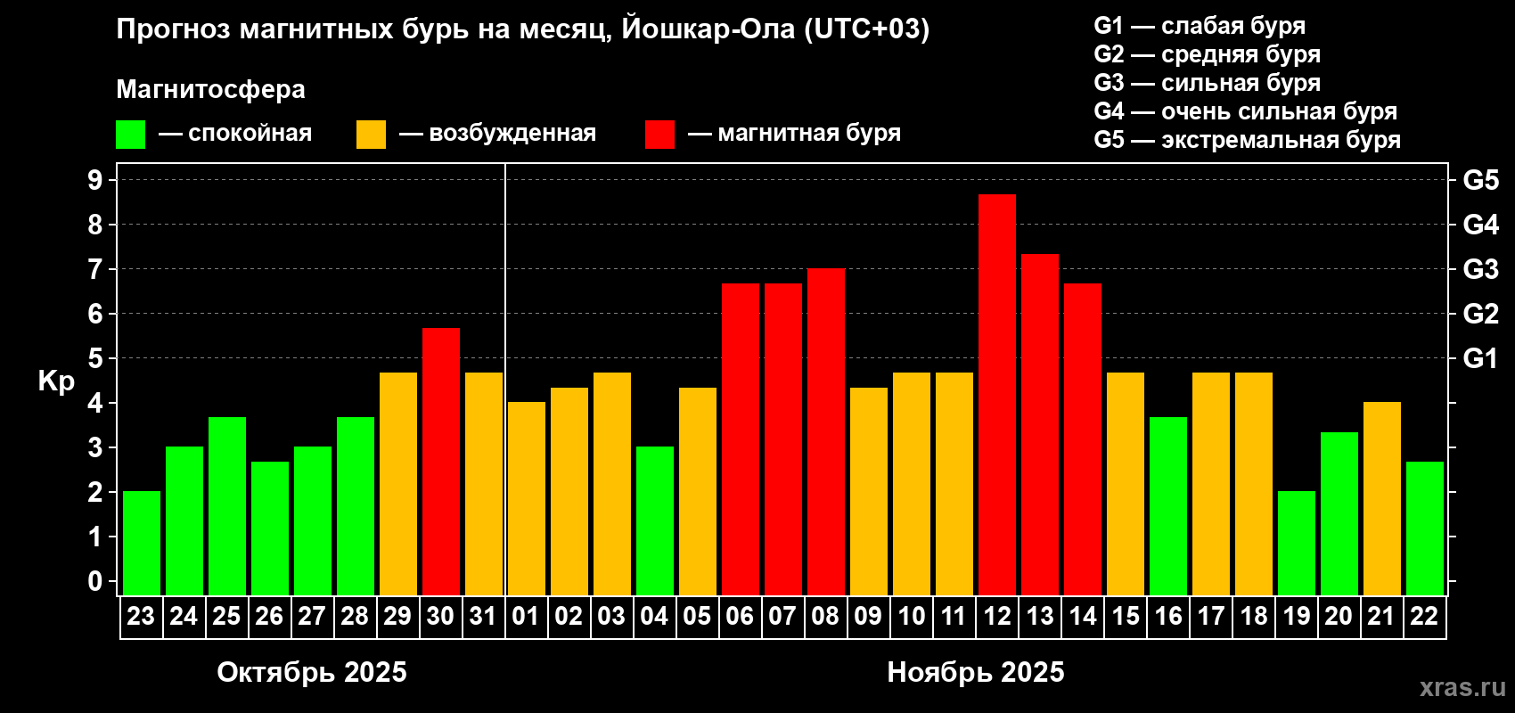 Прогноз магнитных бурь в Йошкар-Оле — 23 октября 2025 года