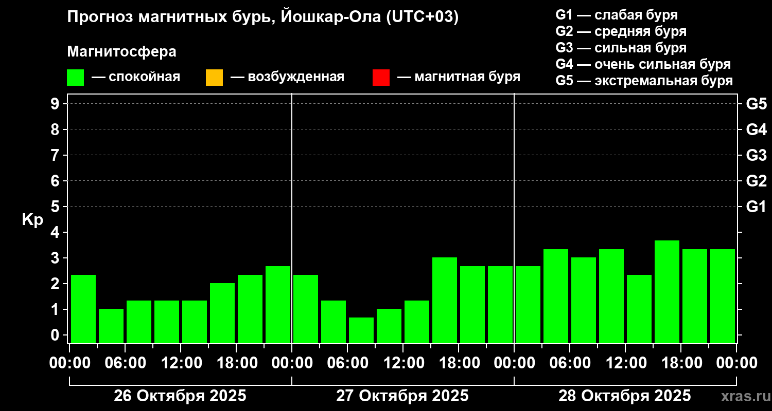 Прогноз магнитных бурь в Йошкар-Оле — 26 октября 2025 года