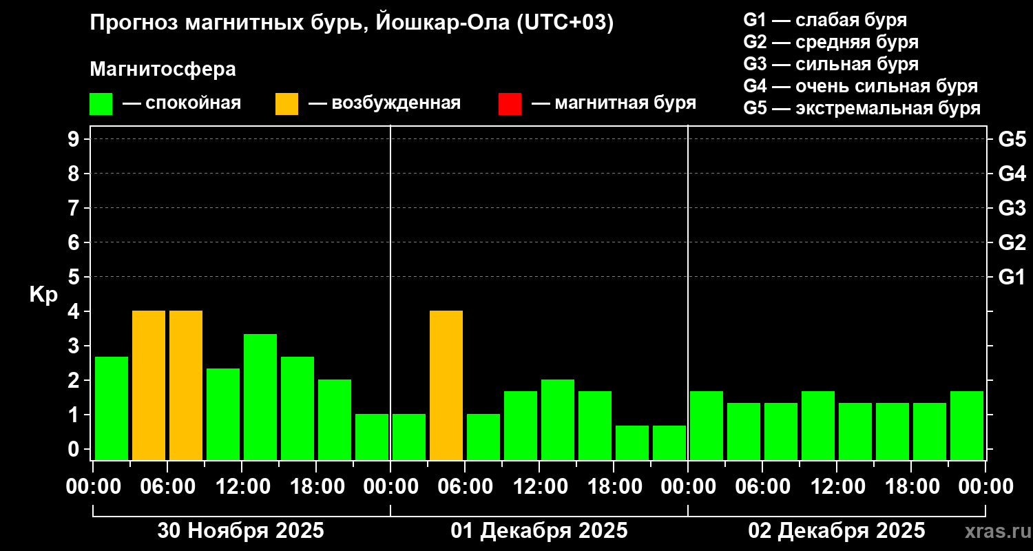 Прогноз магнитных бурь в Йошкар-Оле на 30 ноября 2025 года