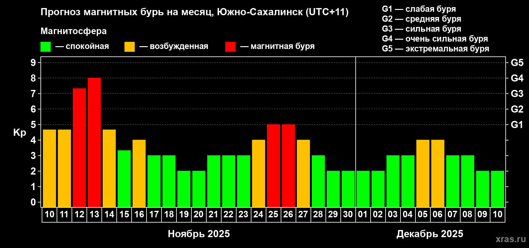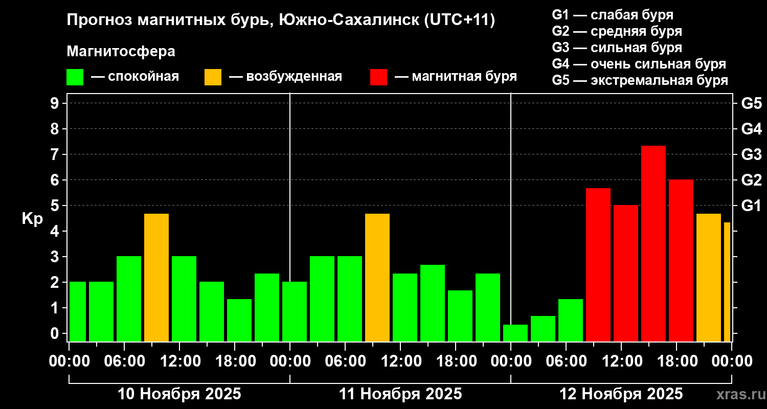 Прогноз магнитных бурь в Южно-Сахалинске — 10 ноября 2025 года