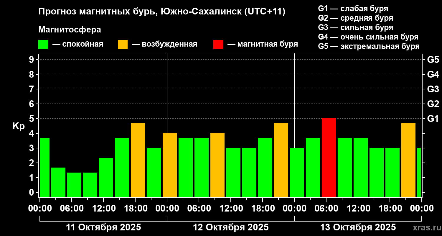 Прогноз магнитных бурь в Южно-Сахалинске — 11 октября 2025 года