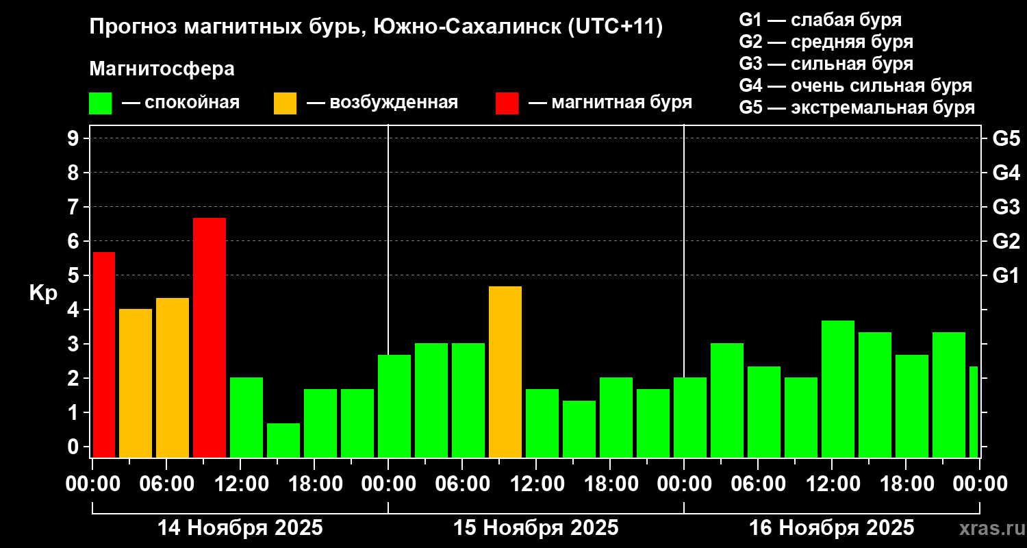 Прогноз магнитных бурь в Южно-Сахалинске — 14 ноября 2025 года