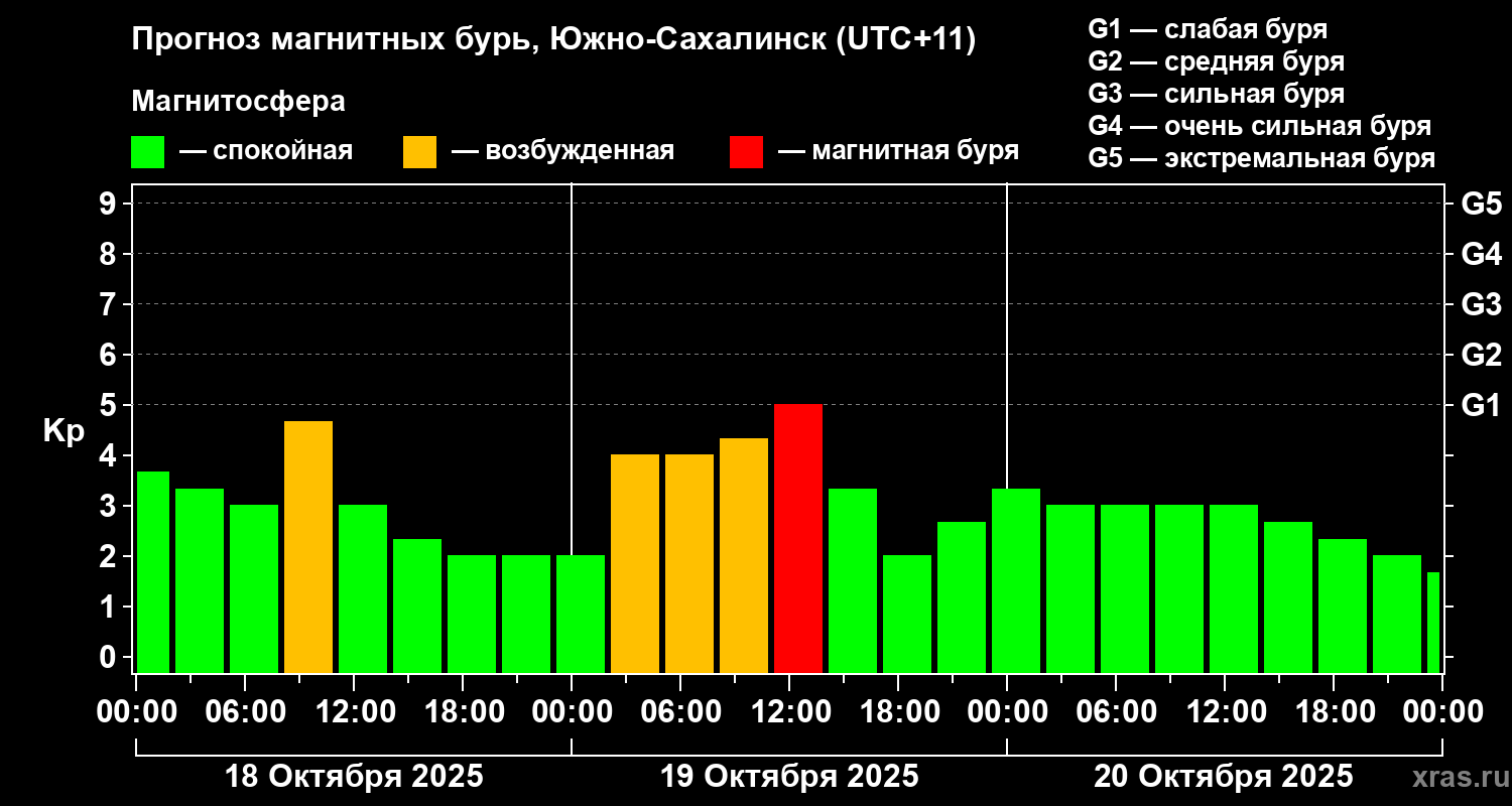 Прогноз магнитных бурь в Южно-Сахалинске — 18 октября 2025 года