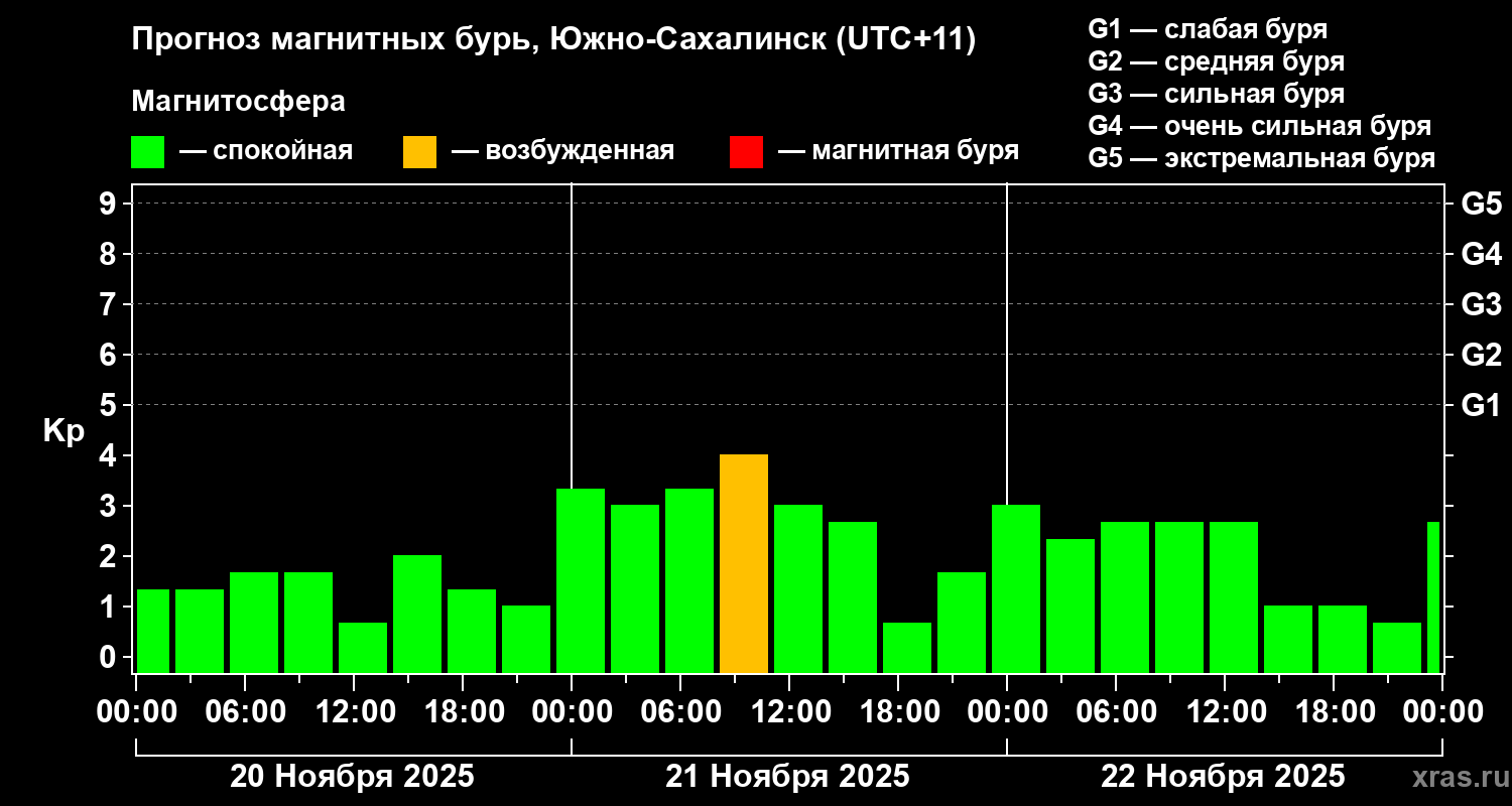 Прогноз магнитных бурь в Южно-Сахалинске — 20 ноября 2025 года
