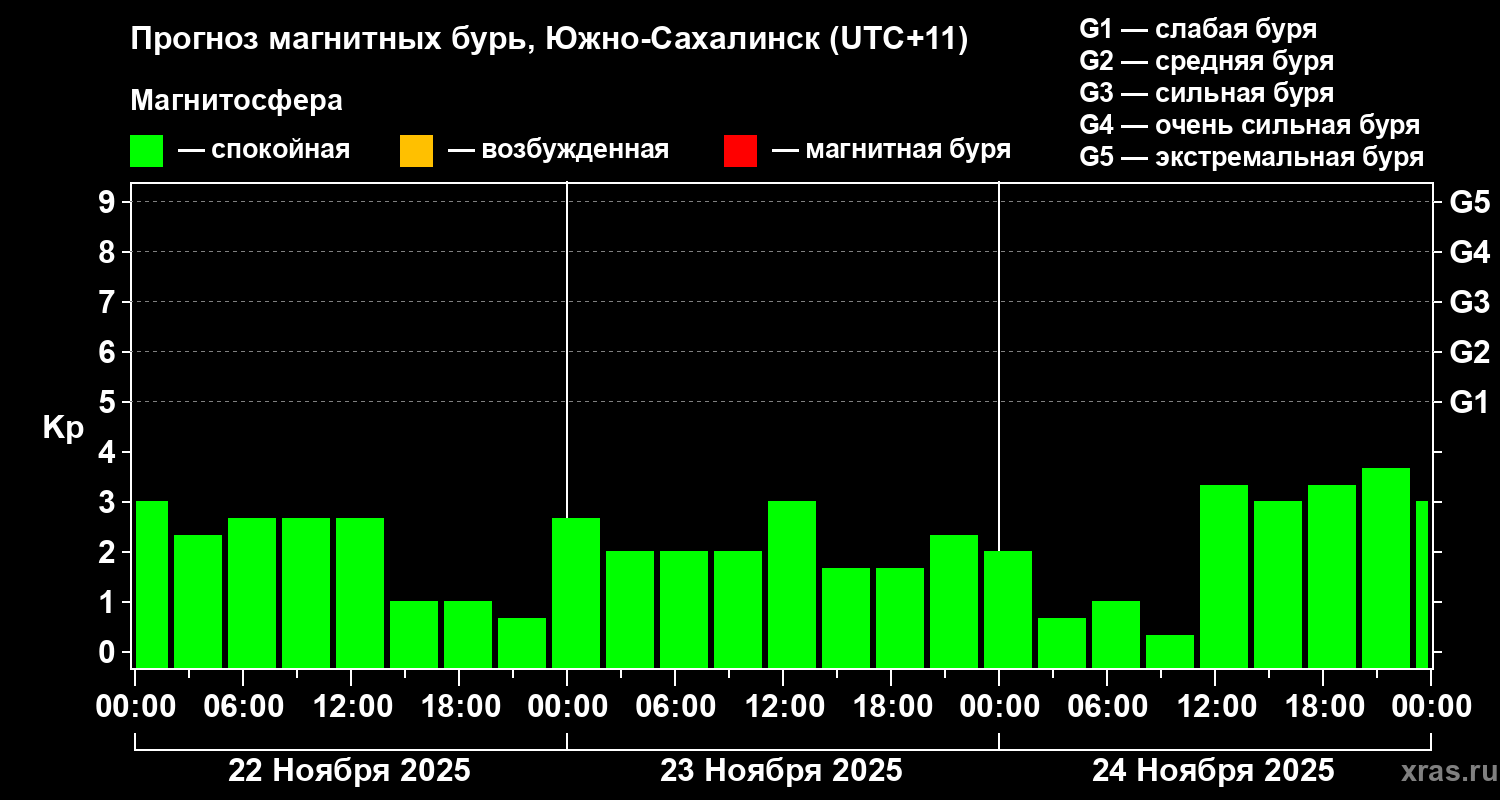 Прогноз магнитных бурь в Южно-Сахалинске — 22 ноября 2025 года