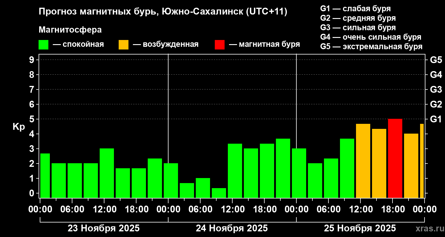 Прогноз магнитных бурь в Южно-Сахалинске — 23 ноября 2025 года