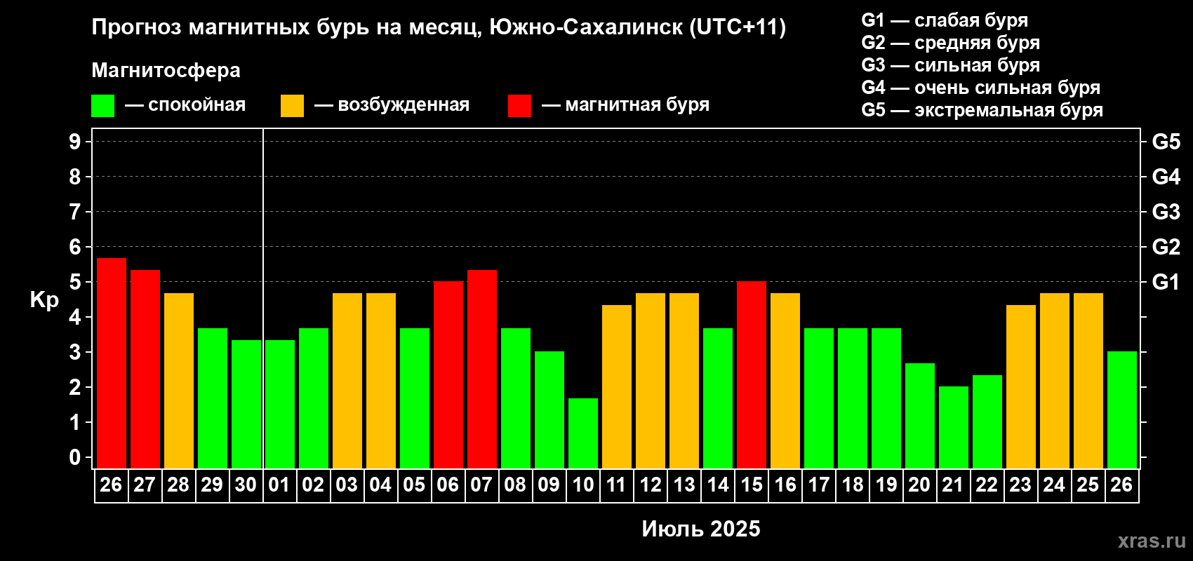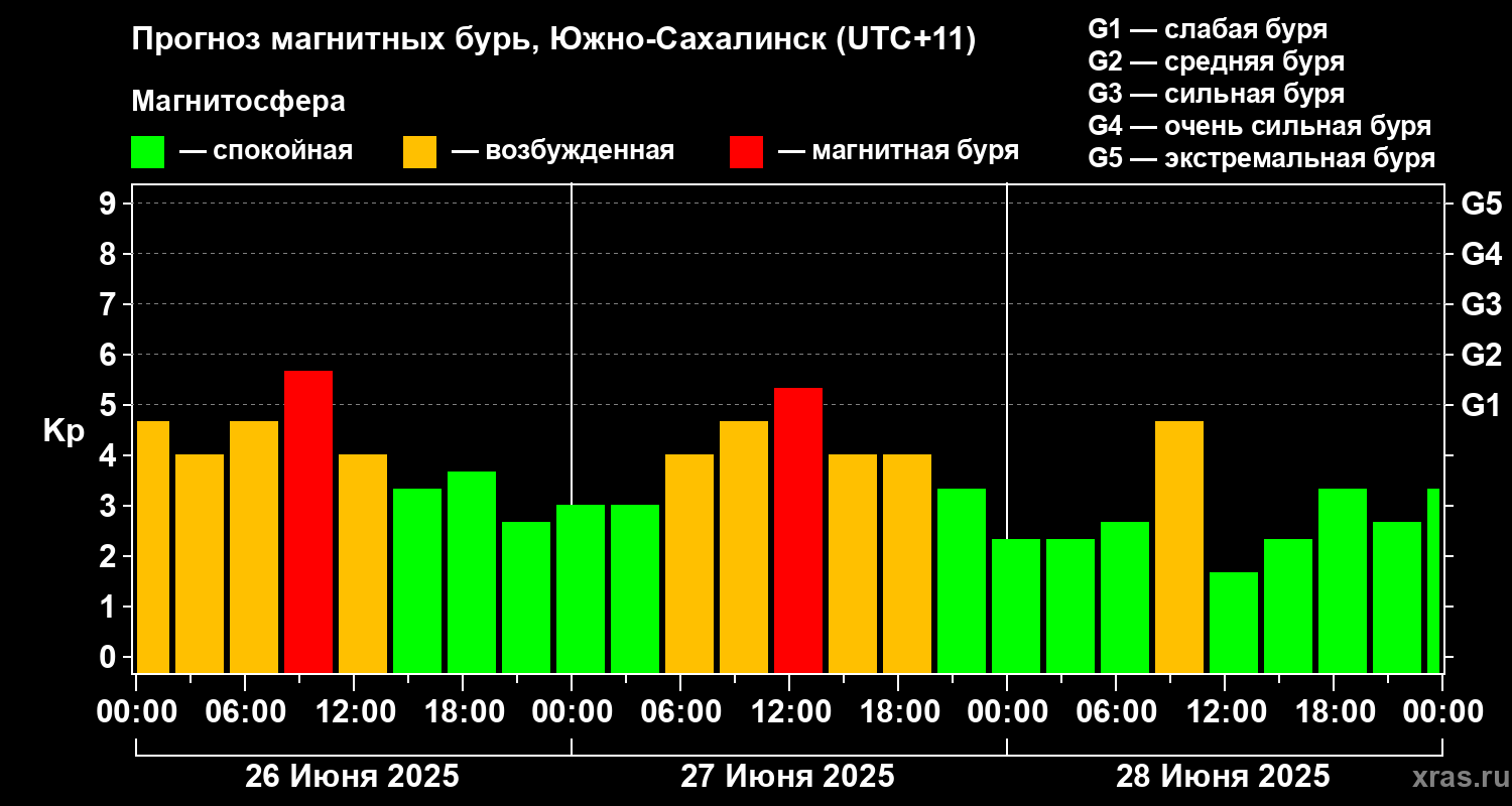Прогноз магнитных бурь в Южно-Сахалинске — 26 июня 2025 года