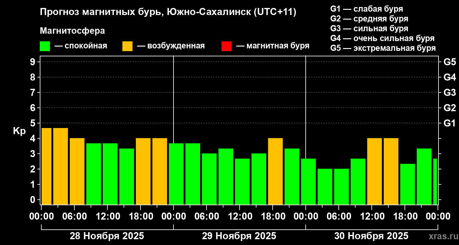 Прогноз магнитных бурь в Южно-Сахалинске — 28 ноября 2025 года