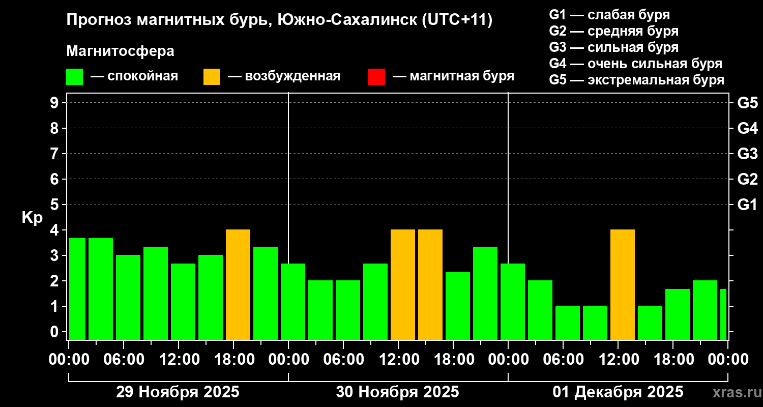 Прогноз магнитных бурь в Южно-Сахалинске на 29 ноября 2025 года