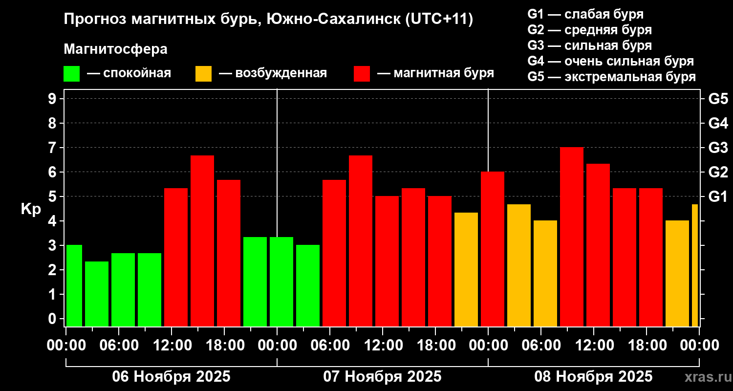 Прогноз магнитных бурь в Южно-Сахалинске — 6 ноября 2025 года