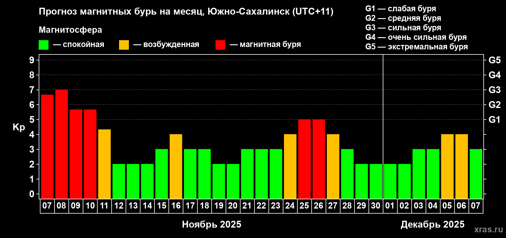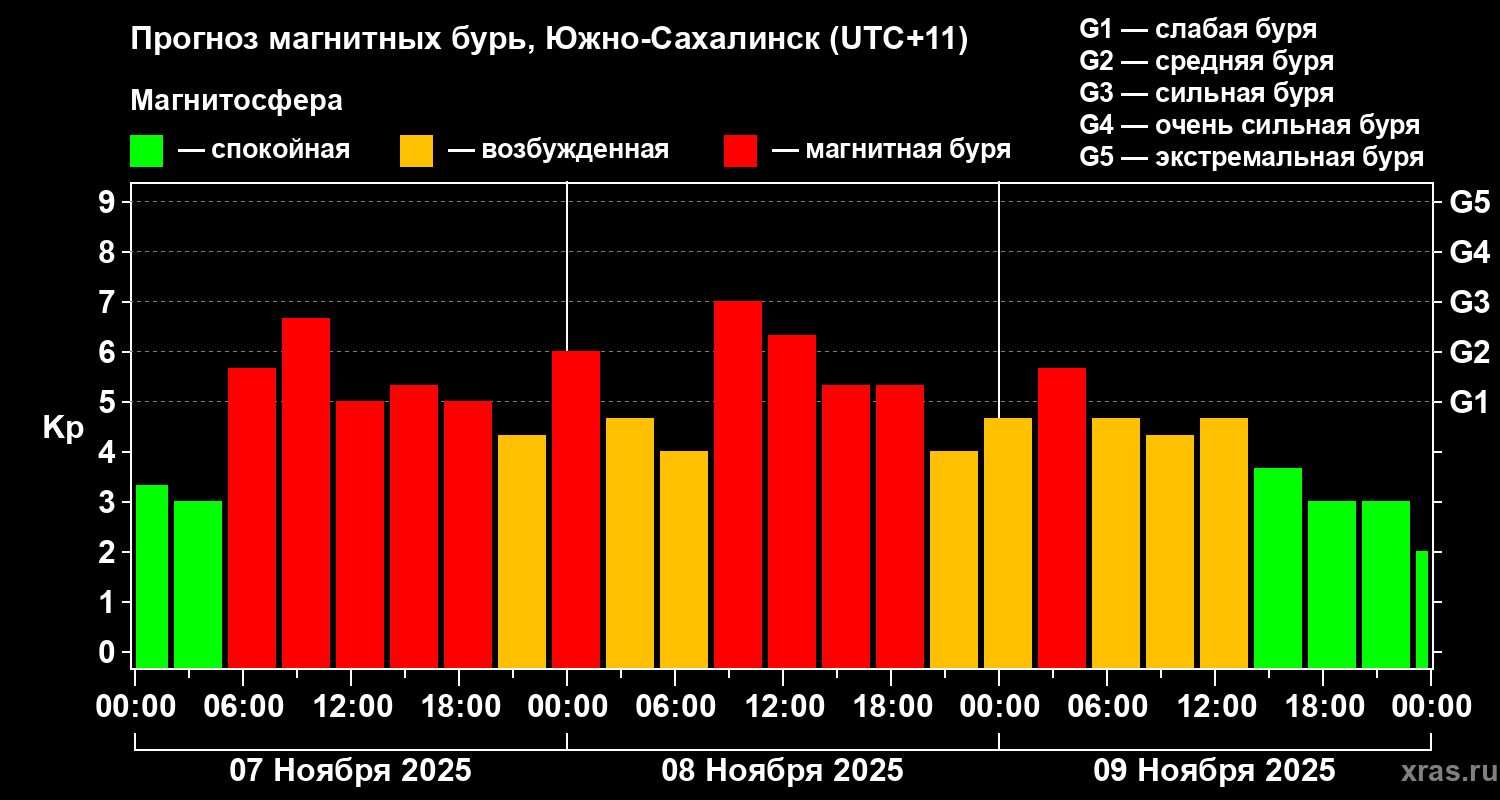Прогноз магнитных бурь в Южно-Сахалинске на 7 ноября 2025 года