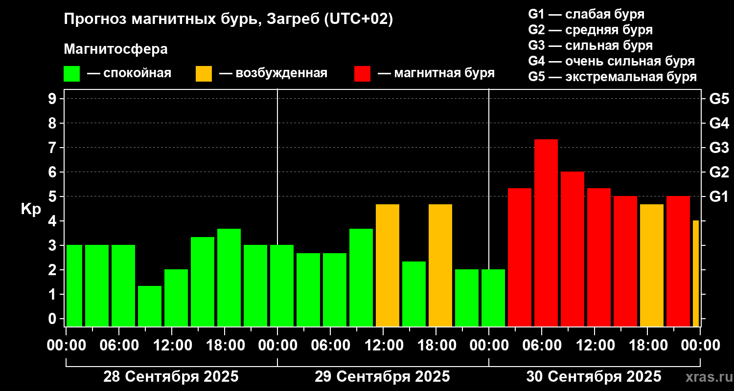 Прогноз магнитных бурь в Загребе — 28 сентября 2025 года