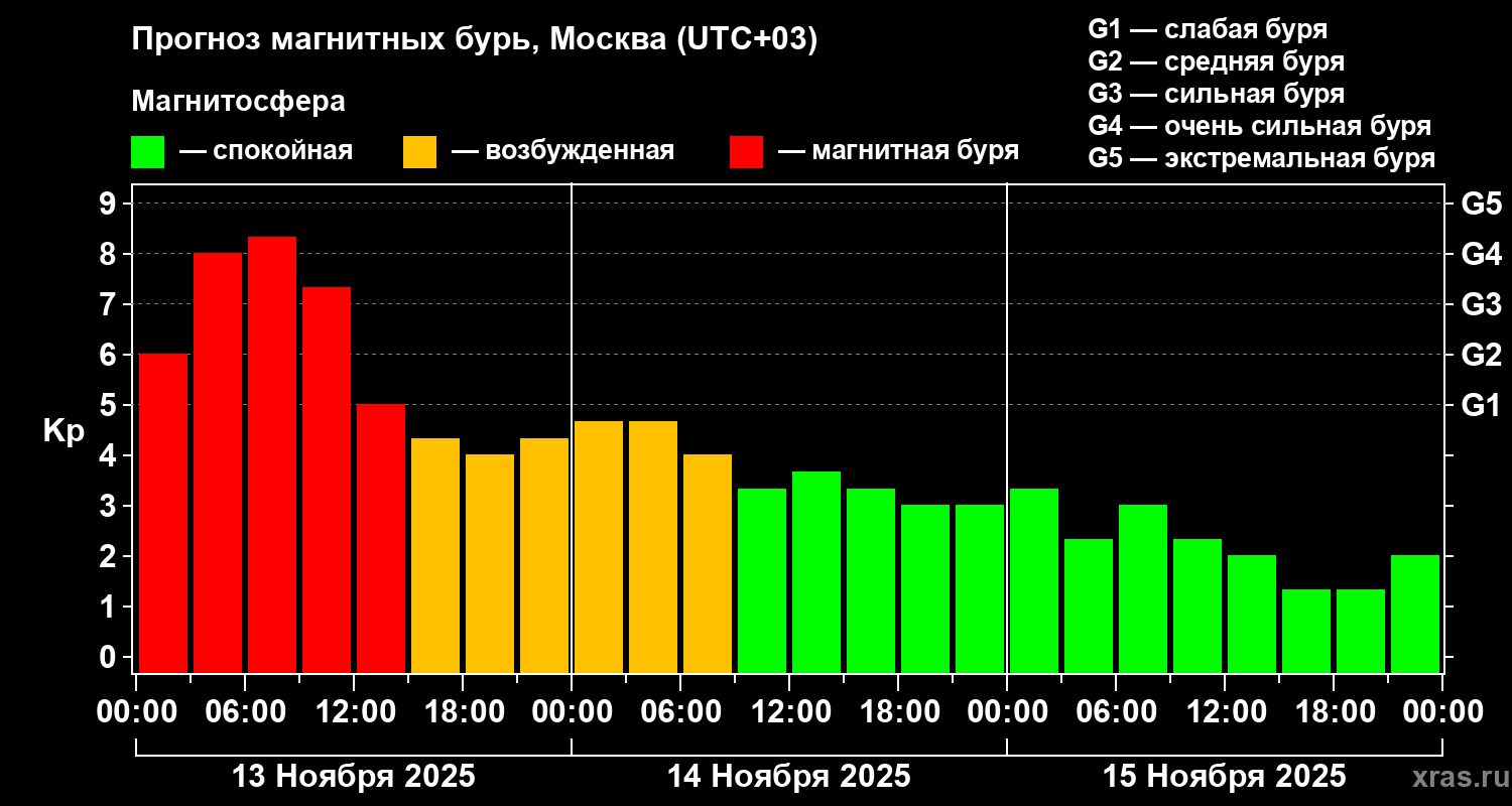 Прогноз магнитных бурь в Москве на 13 ноября 2025 года