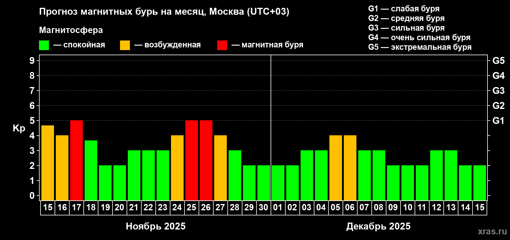 Прогноз магнитных бурь в Москве на 15 ноября 2025 года
