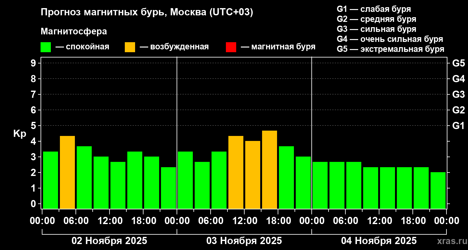 Прогноз магнитных бурь в Москве на 2 ноября 2025 года