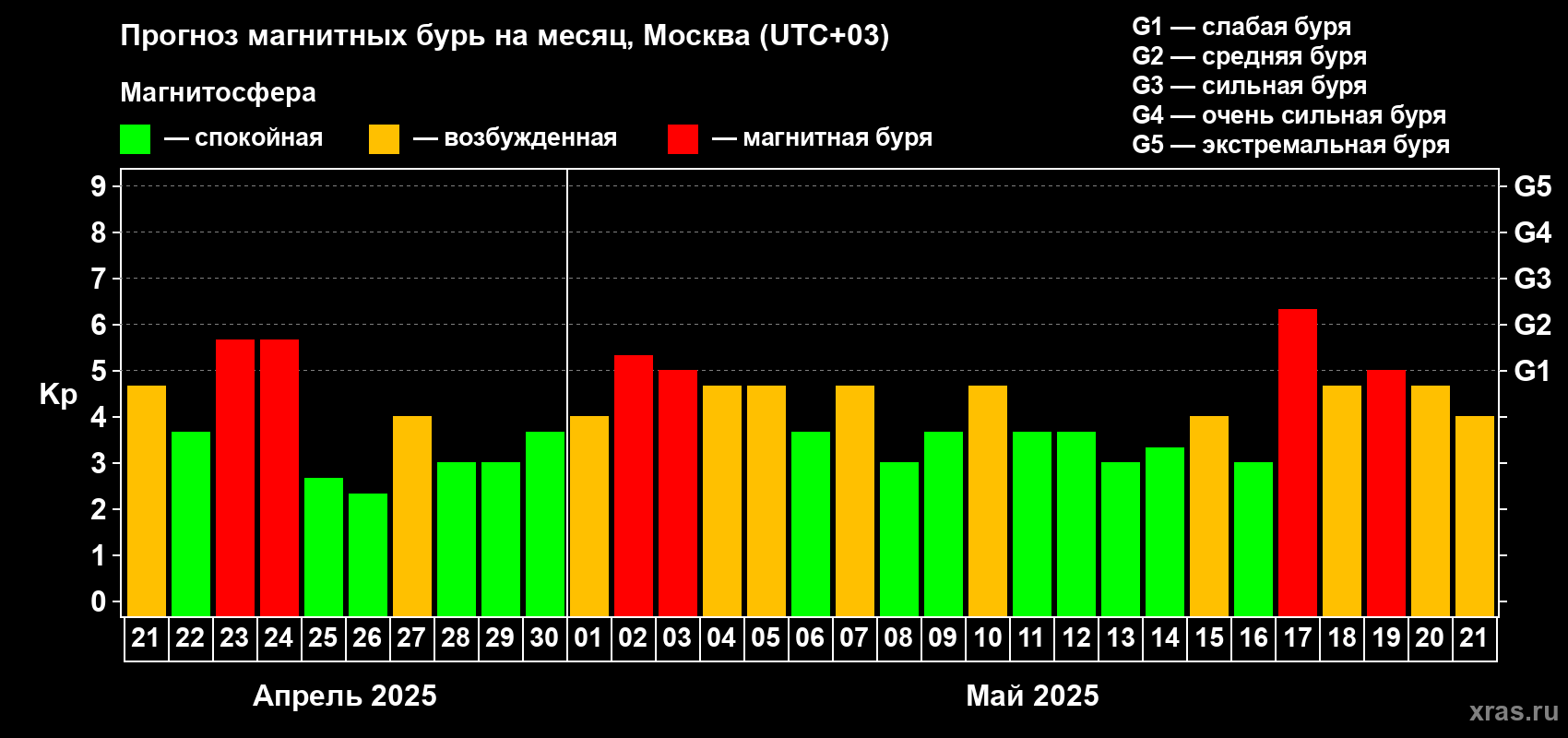 Прогноз магнитных бурь в Москве на 21 апреля 2025 года