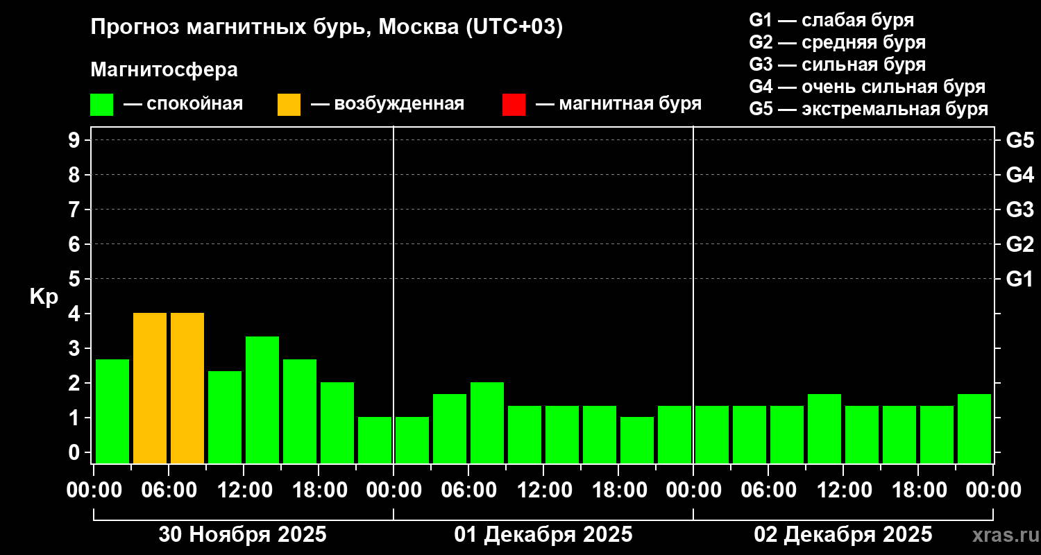 Прогноз магнитных бурь в Москве на 30 ноября 2025 года