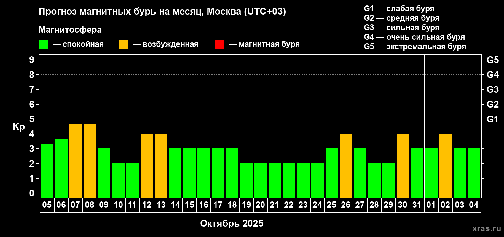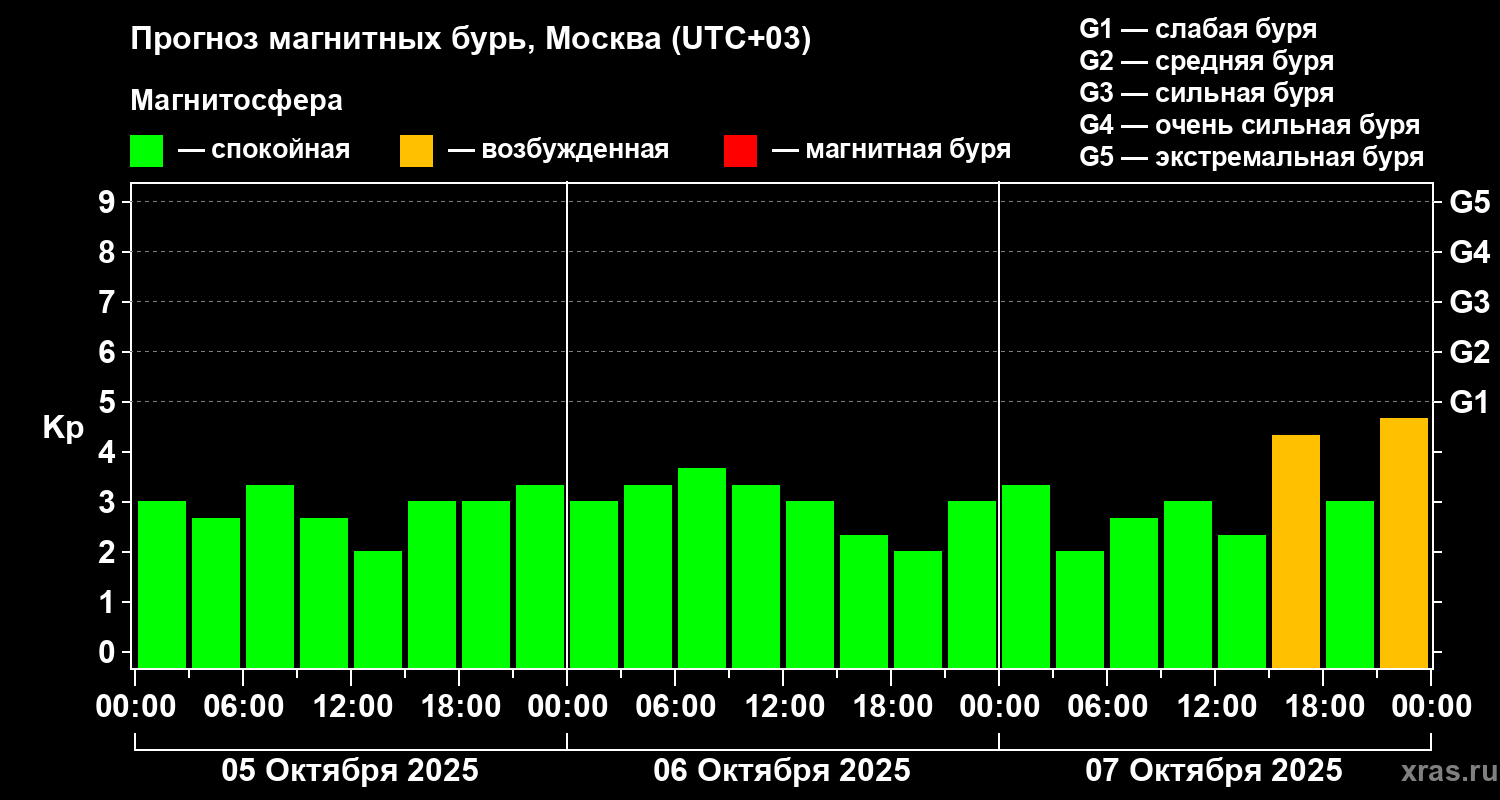 Прогноз магнитных бурь в Москве на 5 октября 2025 года