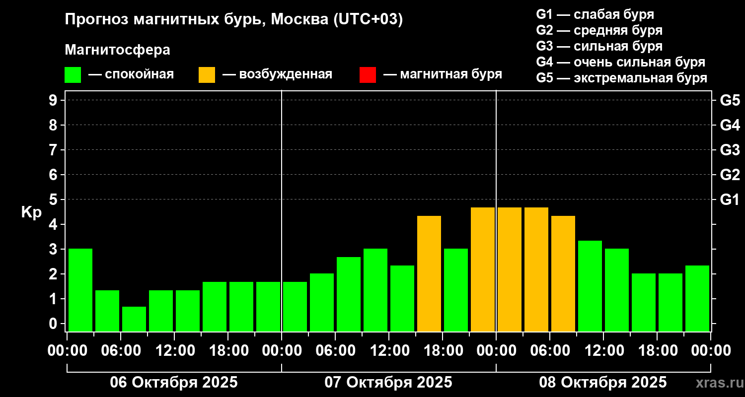 Прогноз магнитных бурь в Москве на 6 октября 2025 года
