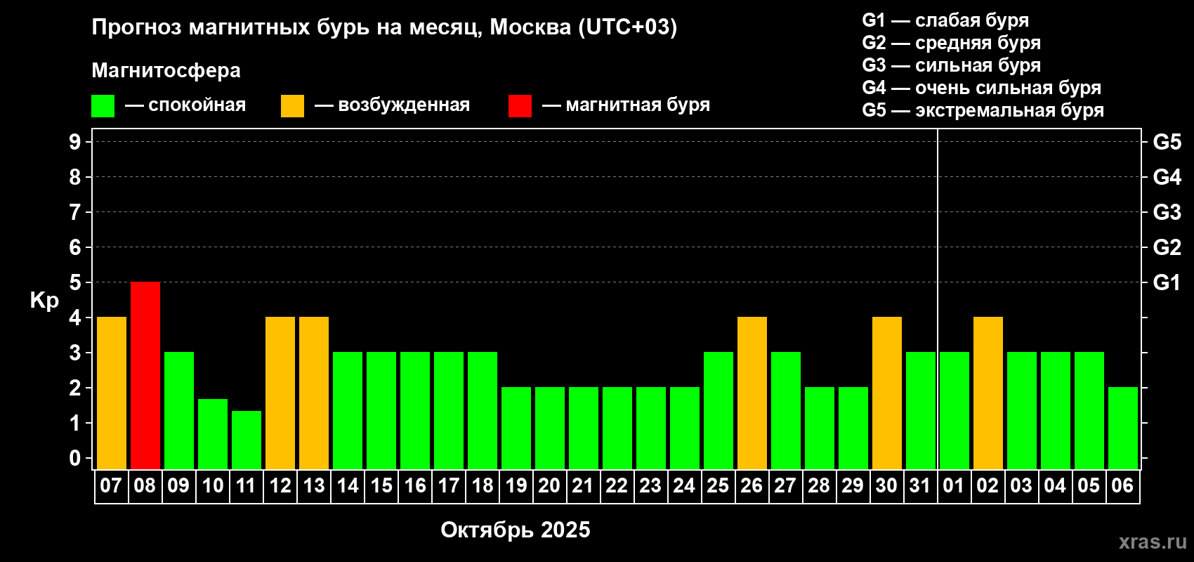 Прогноз магнитных бурь в Москве на 7 октября 2025 года