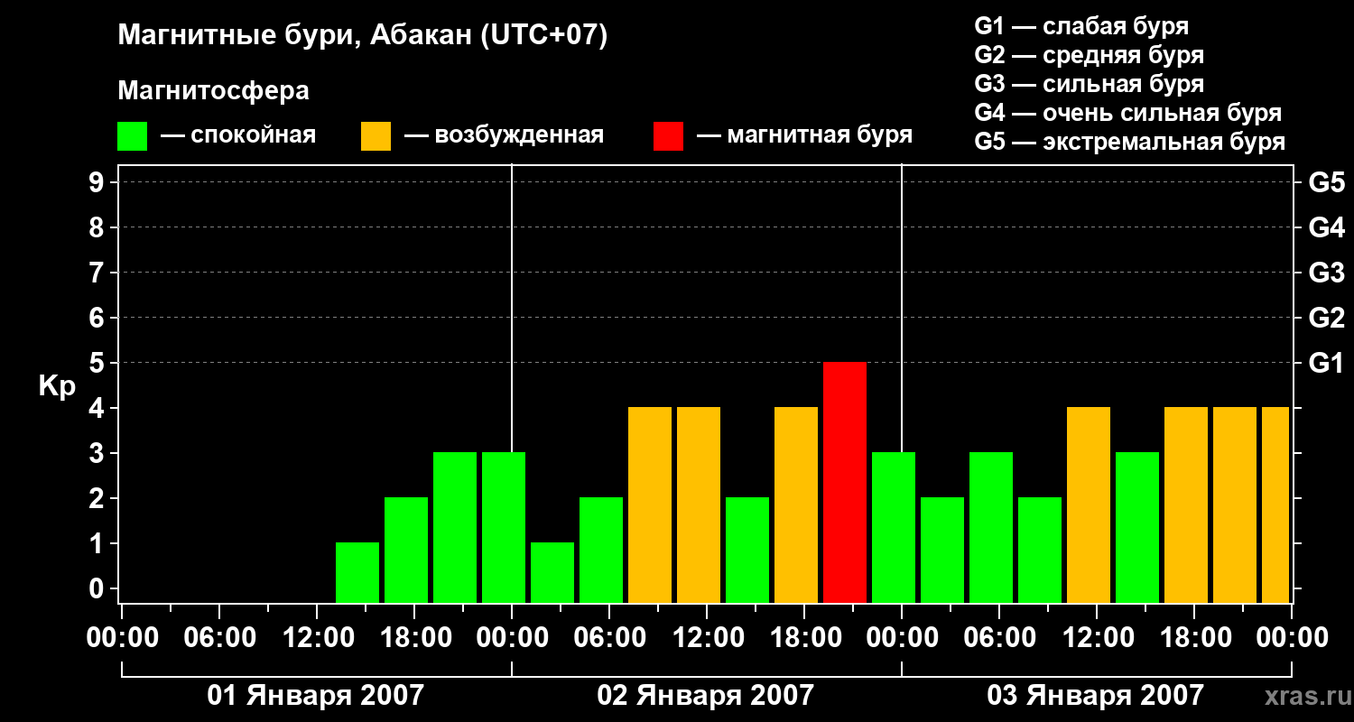 Изменения геомагнитного индекса Kp с 1 по 3 января 2007 года для средних широт