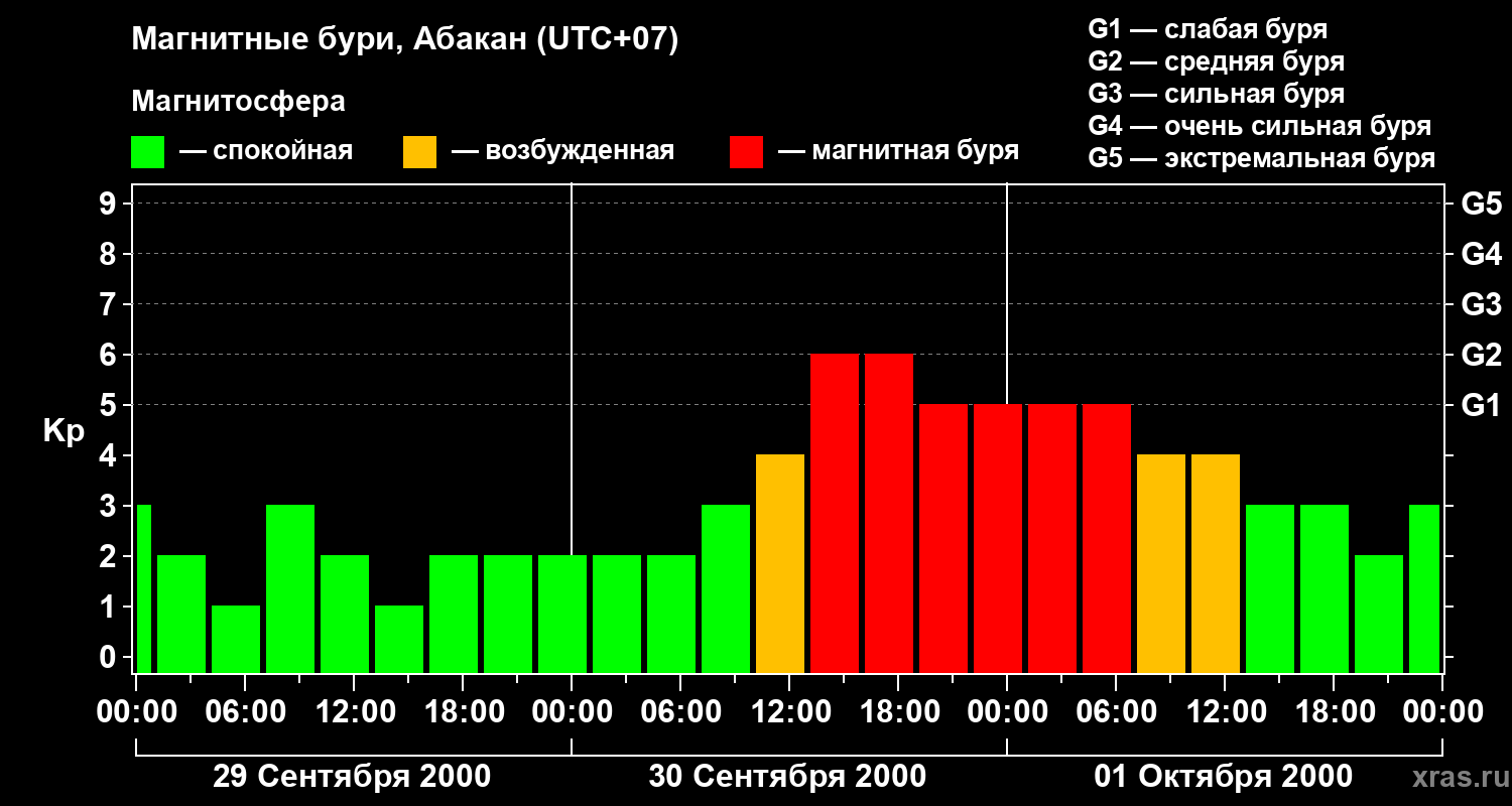 Изменения геомагнитного индекса Kp с 29 сентября по 1 октября 2000 года для средних широт