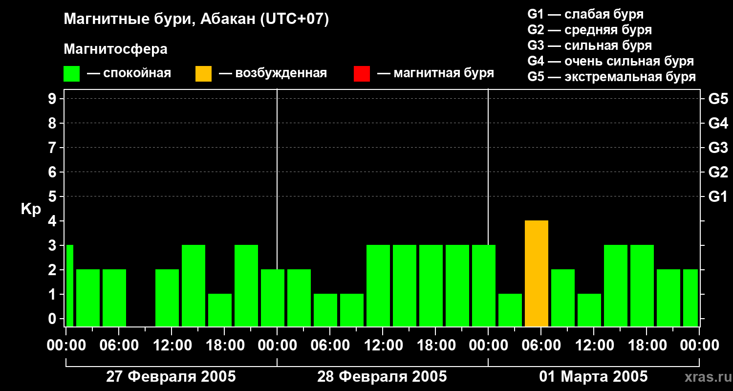 Изменения геомагнитного индекса Kp с 27 февраля по 1 марта 2005 года для средних широт